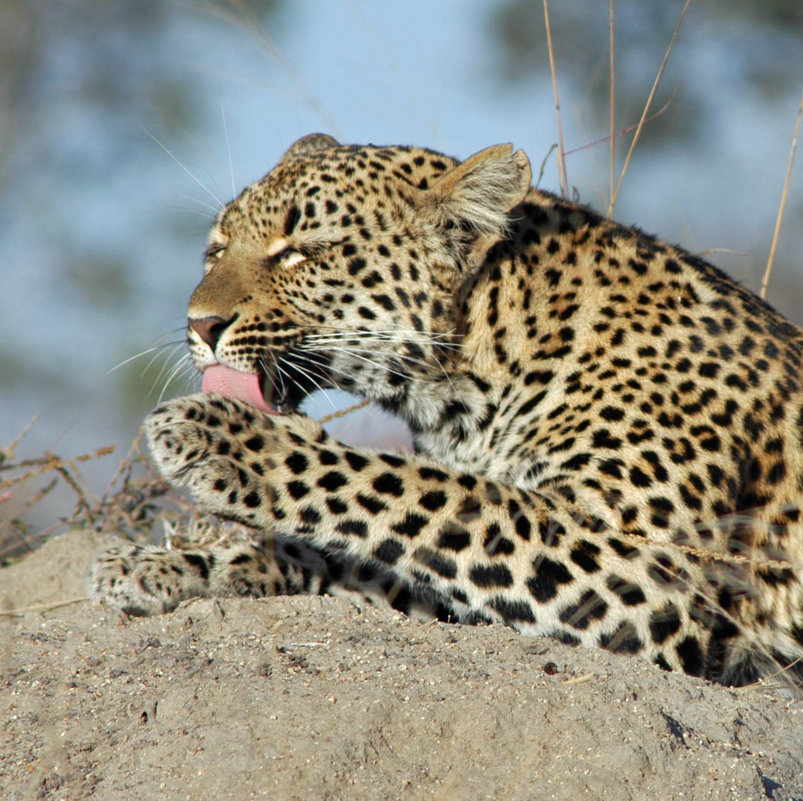 Leopard licking their paw